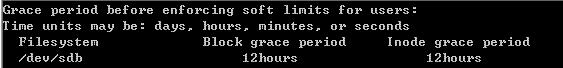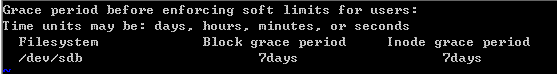 사용자의 계쩡 사용량이 soft limit로 지정한 용량에 도달하였을 때 부터 hard limit 범위 내에서 계정 용량을 초과하여 사용할 수 있도록 한시적으로 적용되는 기간입니다. 이 기간이 경과되면 계정 용량은 soft limit 이상의 용량의 초과하여 계정을 사용할 수 없게 된다. 유예 기간 정보는 edquota 명령에 -t 옵션을 지정하여 확인할 수 있다. 기본값은 1주일로 설정되어 있다.