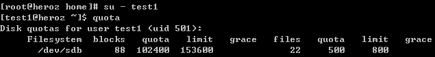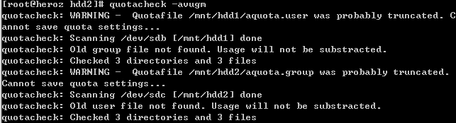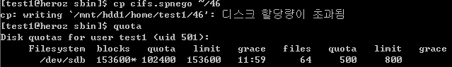 quotacheck 명령을 이용하여 쿼터 상태를 체크하여 /aquota.user 데이터베이스 파일에 저장되도록 한다.
