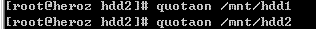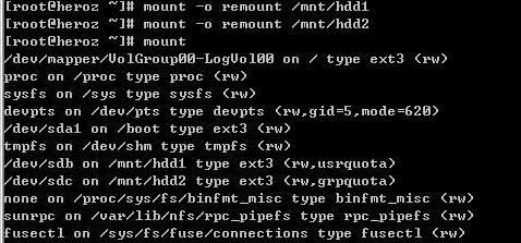 옵션을 추가한 후 해당 파티션에서 쿼터가 적용되도록 하기 위해선 시스템을 재시작해야 한다. 그러나 시스템을 재시작 하지 않고 쿼터를 적용하려면 다음과 같이 마운트를 다시 시켜 주면 된다.