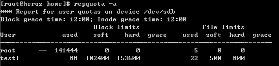 지금까지 설정한 쿼터 상태를 확인하려면 repquota -a 명령을 사용하면 된다.
