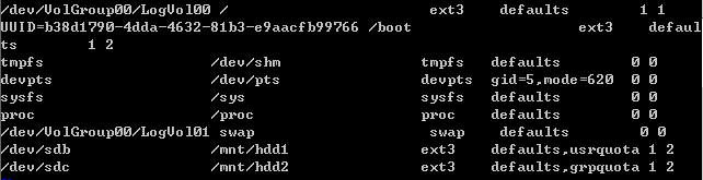 /etc/fstab 파일에서 쿼터를 설정하고자 하는 파티션의 마운트 옵션 필드에 usrquota 또는 grpquota를 추가하여 설정한다. usrquota 옵션은 사용자에게 쿼터를 부여하고자 할 때 사용하며, grpquota 옵션은 그룹에 대해서 쿼터를 부여하고자 할 때 사용한다.