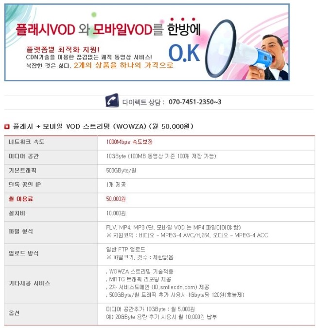 | 기타제공 서비스 | ① 메모리캐시방식 전송 ② MRTG 트래픽 리포팅 제공 ③ 컨텐츠매니저 (업로드, 관리웹툴) 제공 ④ smilecast.co.kr 서브도메인 무료 제공 ⑤ FTP 지원 | |